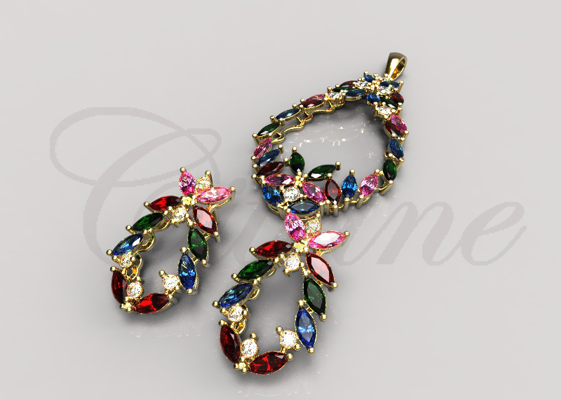 This exquisite jewelry set showcases a lively composition of marquise-cut gemstones in vivid colors, including deep red, royal blue, emerald green, and pink. Crafted in polished yellow gold, each stone is delicately prong-set, forming an elegant and eye-catching ensemble. Perfect for special occasions and to express a joyful spirit.