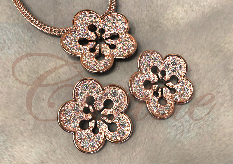 This charming jewelry set features a delicate floral motif crafted in warm rose gold and fully encrusted with shimmering pavé diamonds. The design highlights intricate openwork petals, creating a sophisticated play of light and texture. Perfect for adding a romantic touch to any occasion.