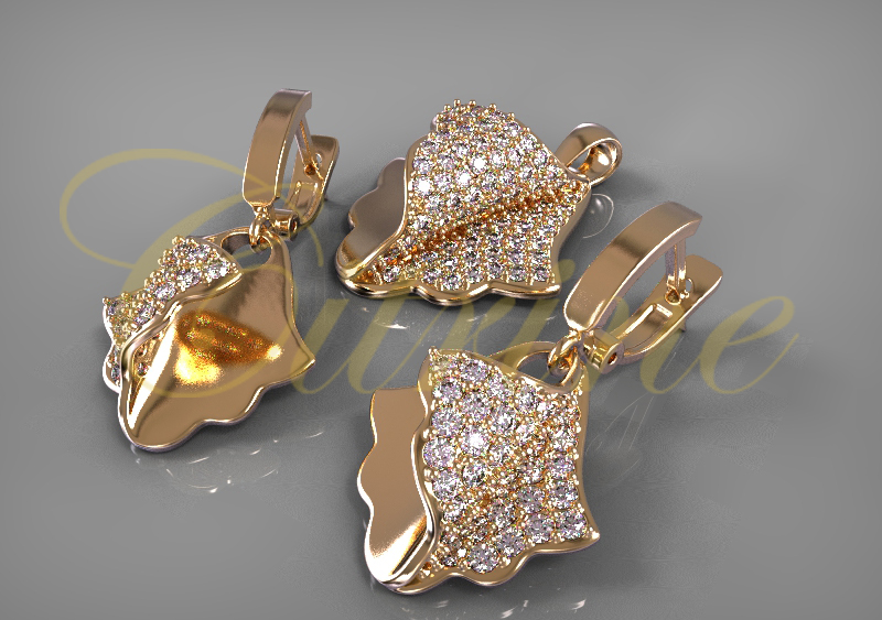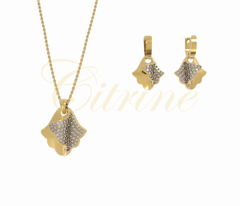 This elegant jewelry set draws inspiration from nature with its sculpted leaf motifs, meticulously crafted in polished gold. Each piece sparkles with pavé-set diamonds, creating an enchanting texture that catches the light from every angle. This set includes matching earrings and a pendant, offering a cohesive and sophisticated look perfect for special occasions or elevating everyday style.
