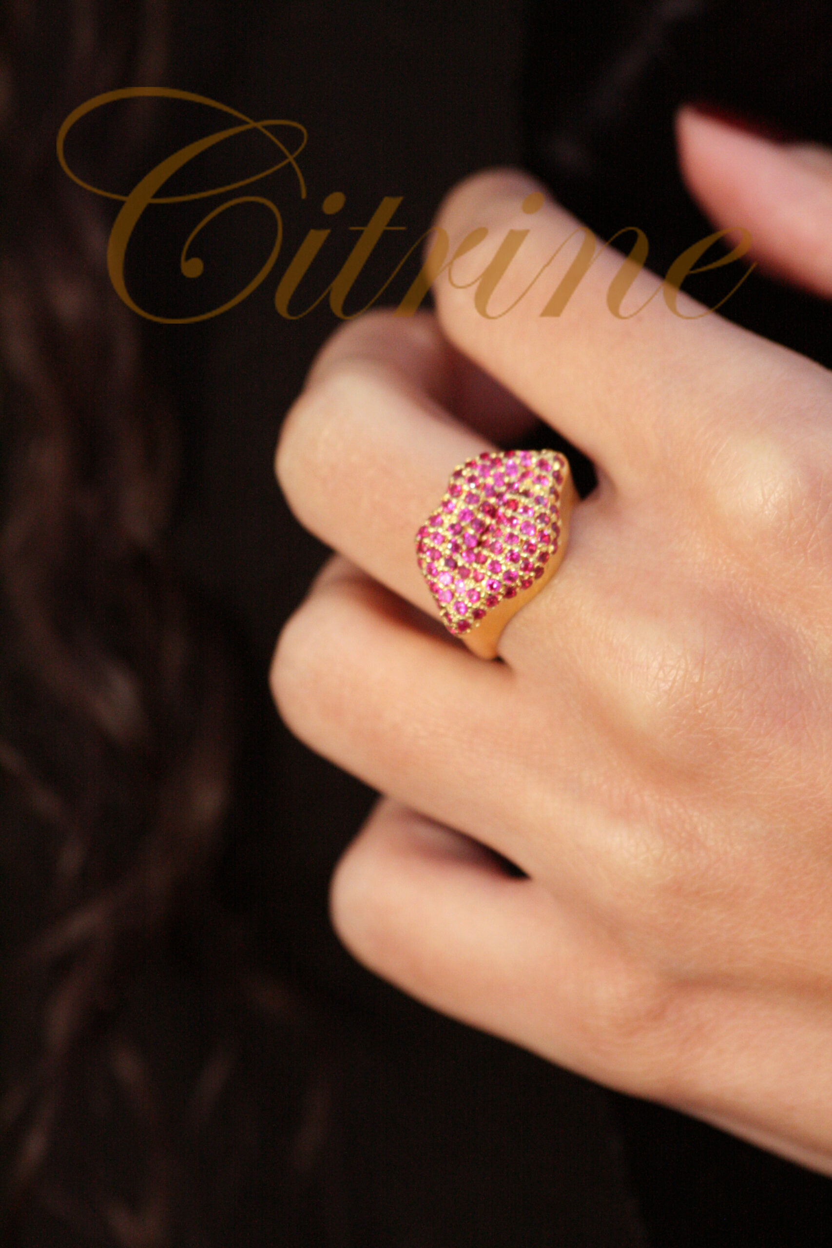 A bold lip-shaped gold ring pavé-set with vibrant pink stones.