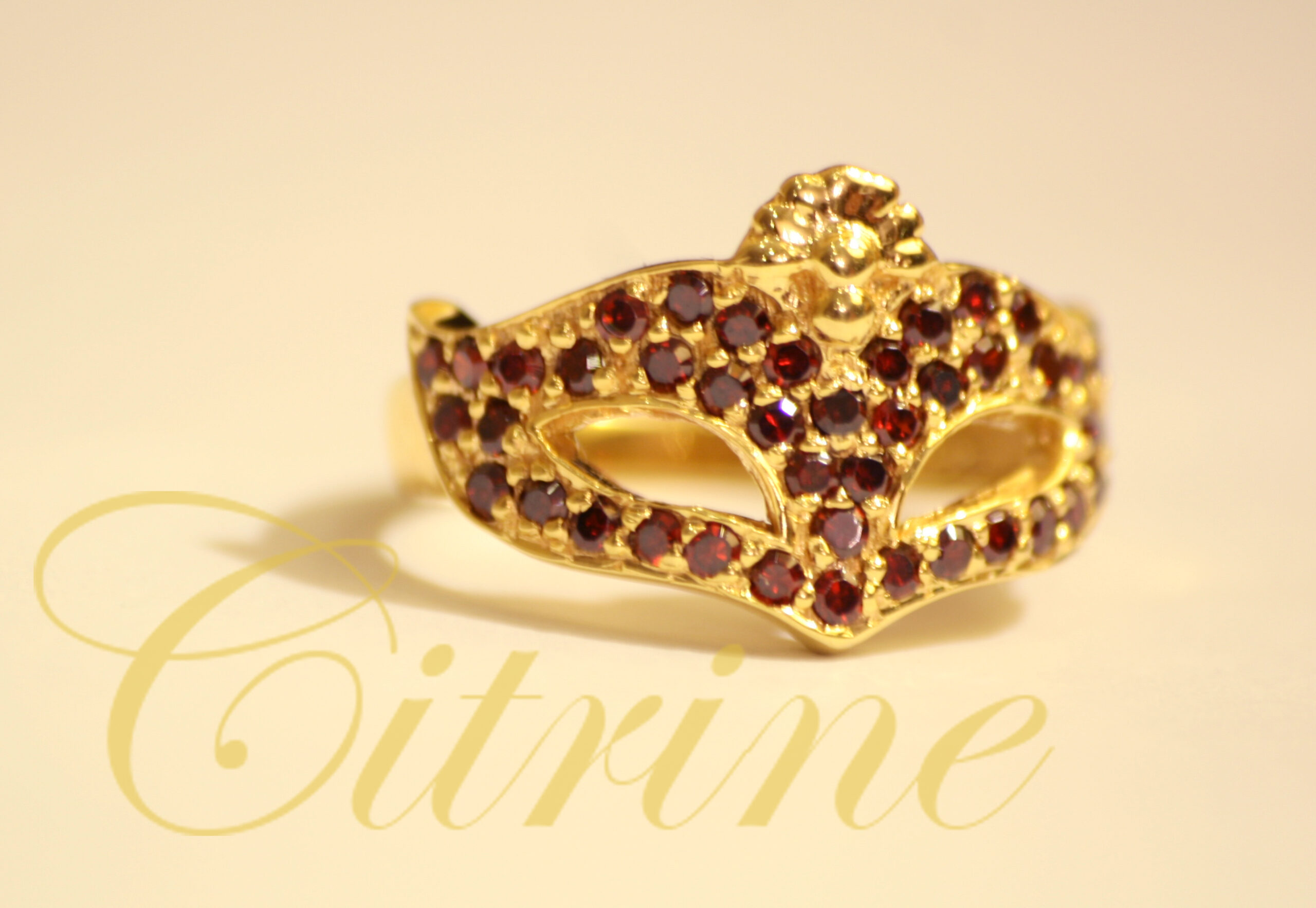 Unveil your mysterious allure with this striking gold ring inspired by the elegance of a masquerade mask. Encrusted with a lavish arrangement of deep red gemstones, this design captures the drama and sophistication of Venetian carnivals. Perfect for evening events, statement looks, or as a signature piece in your collection, this ring celebrates the blend of luxury and enigma in every detail.