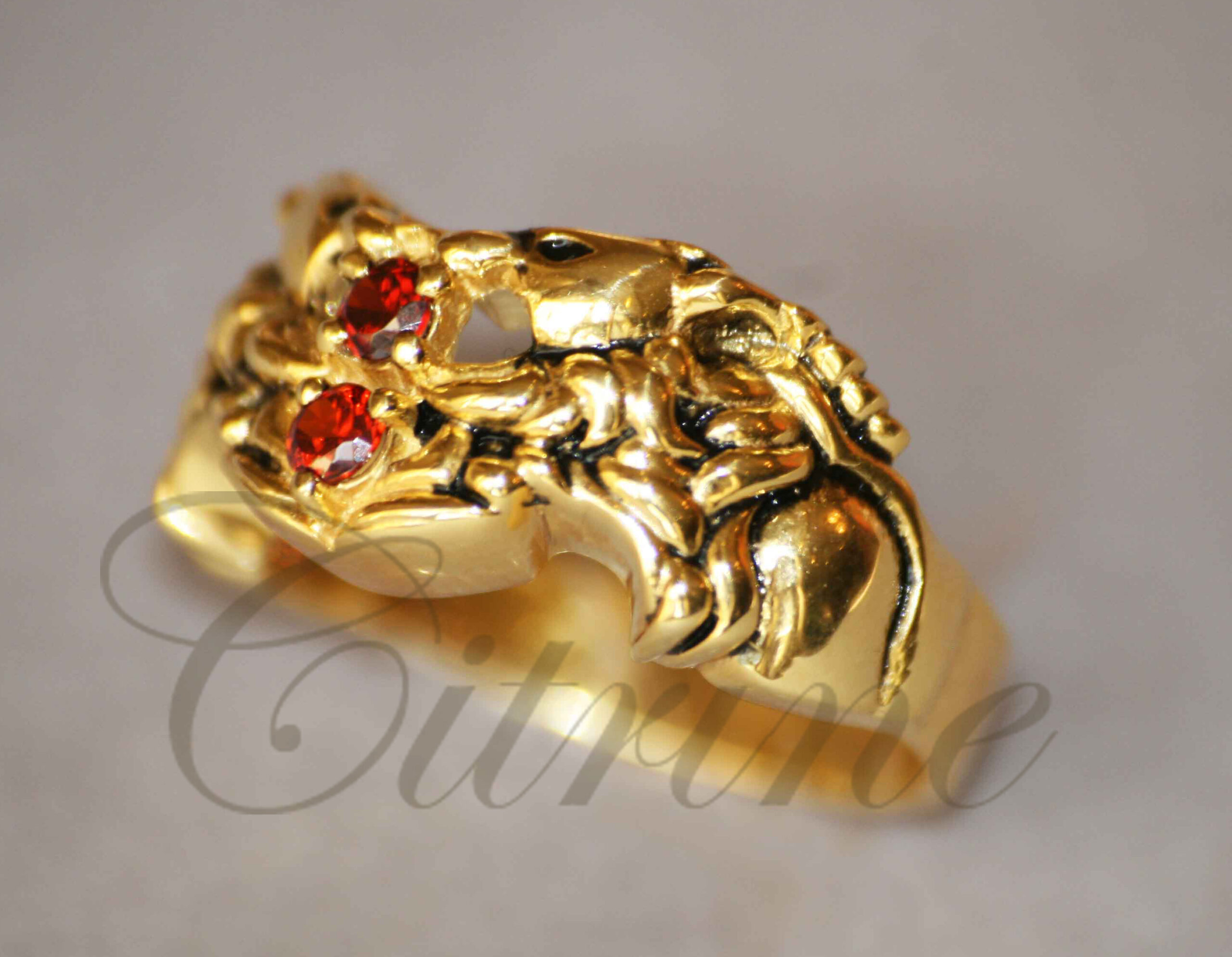 A statement piece that exudes power and elegance, this gold ring showcases a sculpted lion motif in stunning relief. Two vivid red gemstones are set in the design to add a dramatic accent and a touch of opulence. The detailed craftsmanship celebrates strength, confidence, and regal style. Ideal for collectors, luxury jewellery enthusiasts, or as a meaningful gift symbolising courage and nobility.