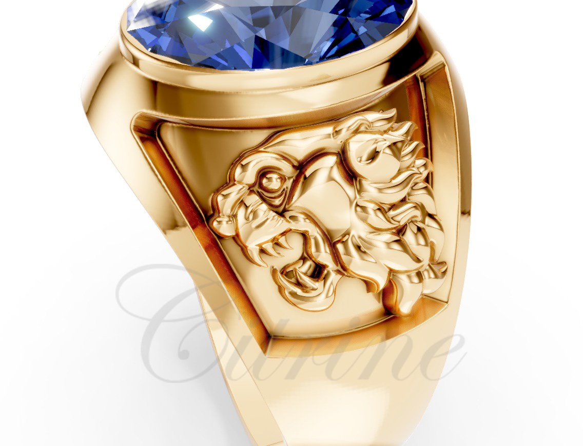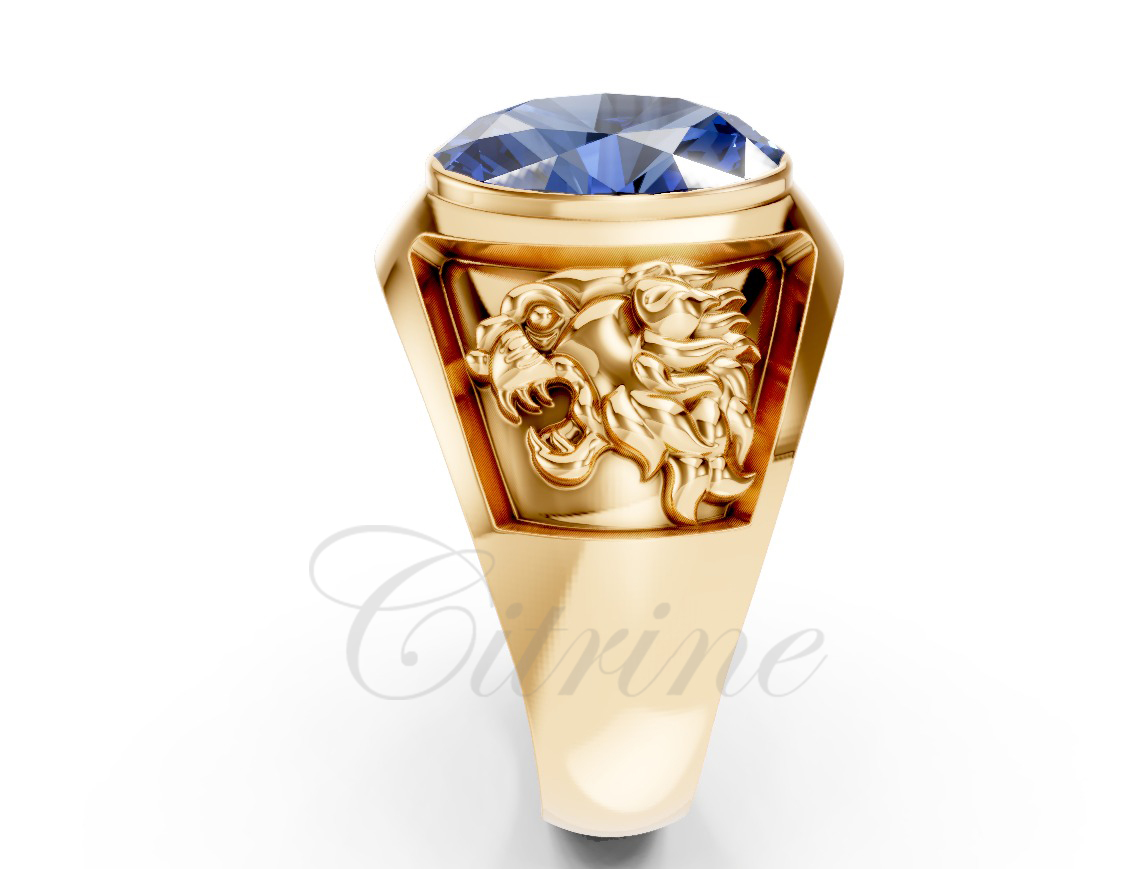 Experience timeless grandeur with this remarkable gold signet ring. The design centers around a vivid oval-cut blue sapphire, carefully set to maximize brilliance. Along the side, an intricately engraved Persian lion adds a touch of cultural symbolism and unmatched artistry. Perfect for collectors and those who appreciate bold statement pieces, this ring seamlessly merges luxury, heritage, and contemporary elegance.