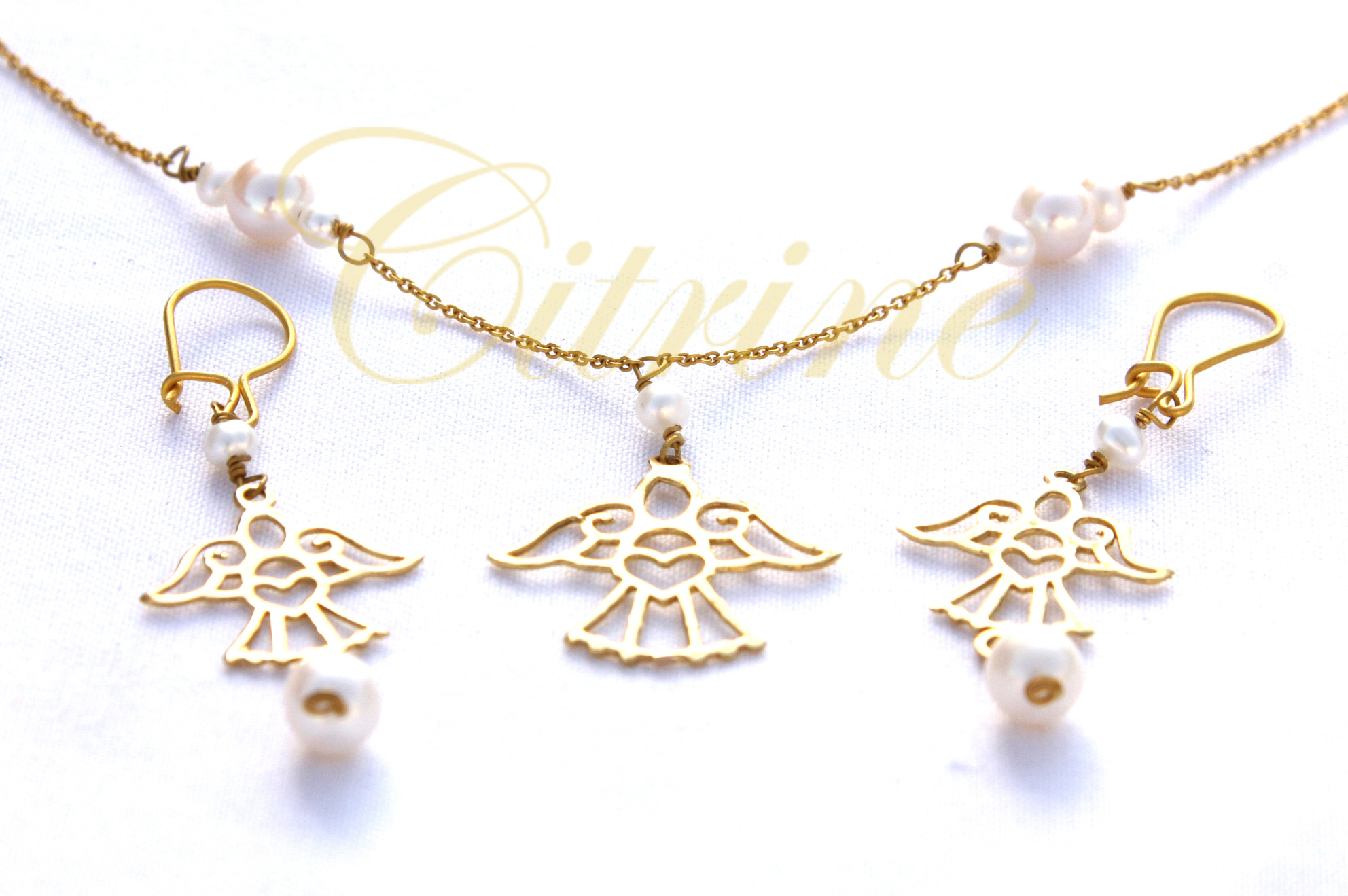 This charming handmade jewelry set features graceful angel silhouettes holding hearts, paired with luminous freshwater pearls for an ethereal look. The set includes a necklace and matching earrings, designed to bring a touch of serenity and elegance to any outfit. Perfect for gifting or personal wear.
