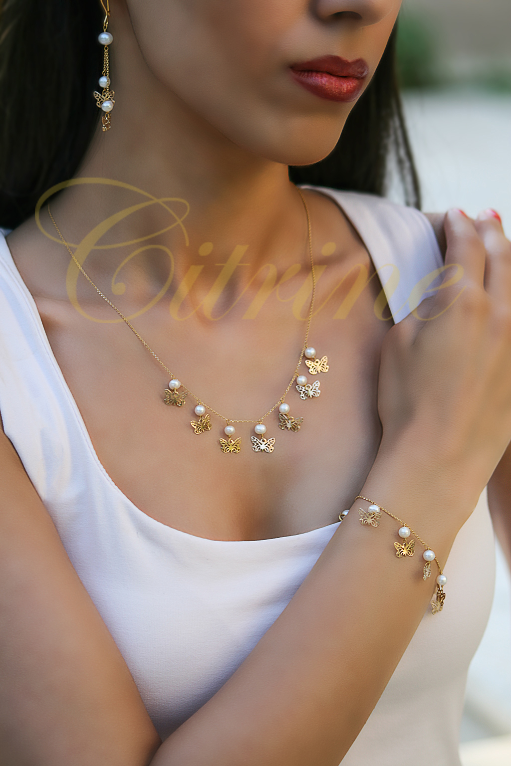 This enchanting handmade jewelry set features graceful butterfly charms paired with luminous freshwater pearls. The necklace, bracelet, and earrings create a harmonious ensemble, perfect for adding a touch of playful sophistication to any outfit. Ideal for gifting or enhancing your personal collection.