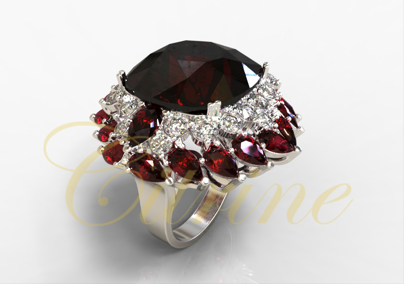 This Oval Garnet and Diamond Halo Statement Ring is a breathtaking celebration of vibrant color and sparkling brilliance. The centerpiece is a large oval-cut deep red garnet, encircled by a halo of pear-shaped garnets and dazzling white diamonds. The intricate arrangement of gemstones creates a luxurious floral-inspired silhouette, making this ring an unforgettable piece for any elegant occasion or a collector’s showcase.