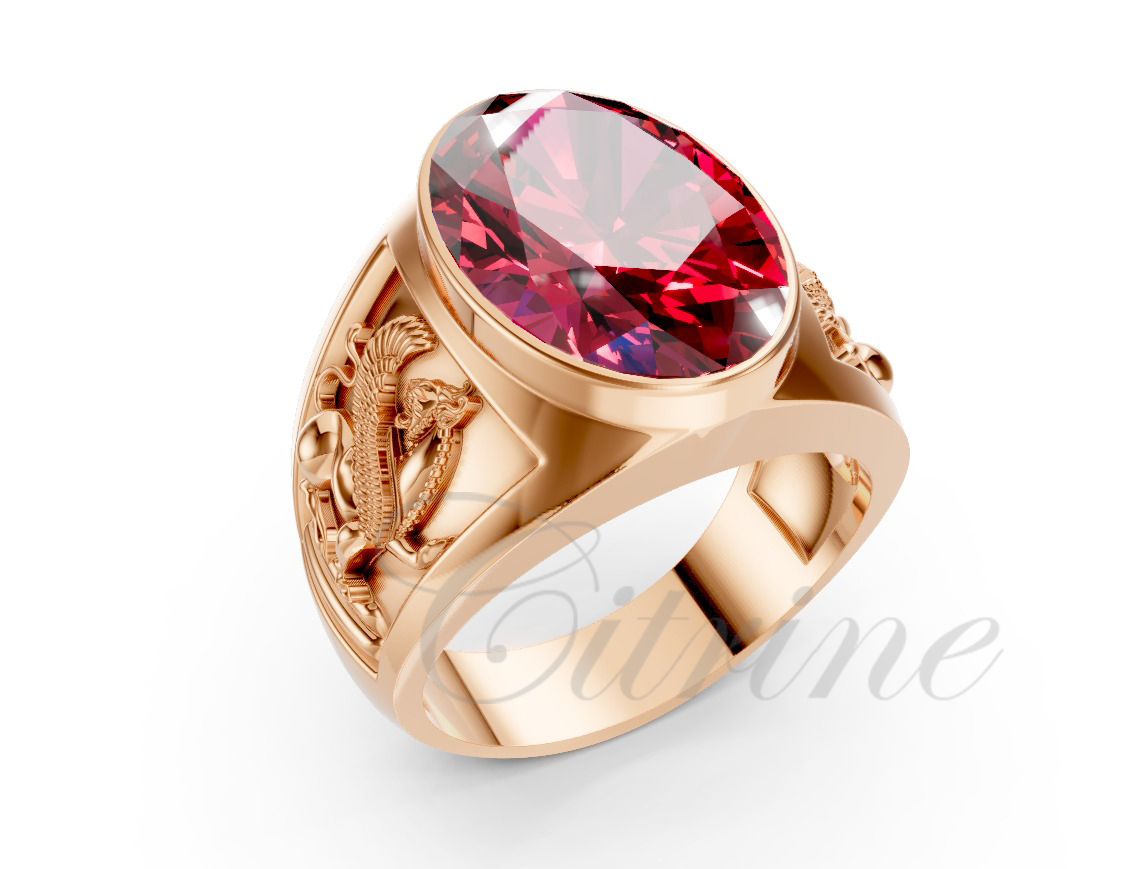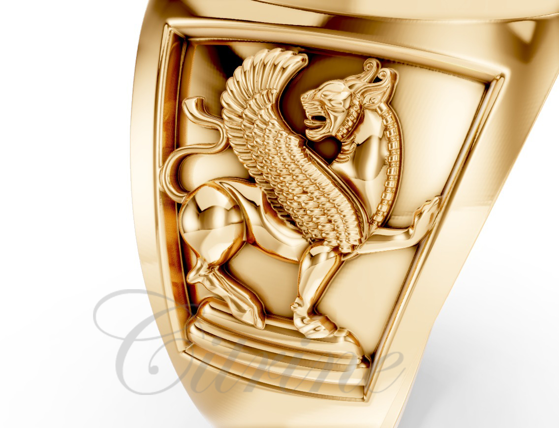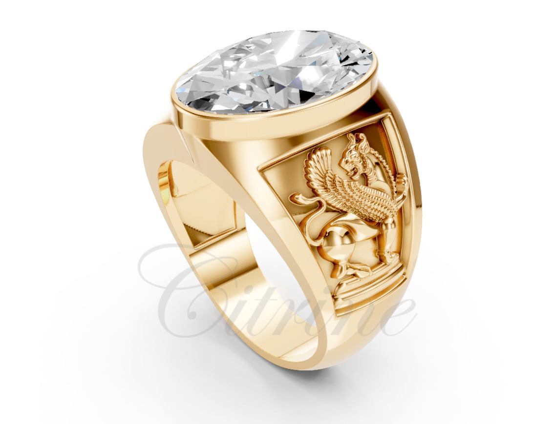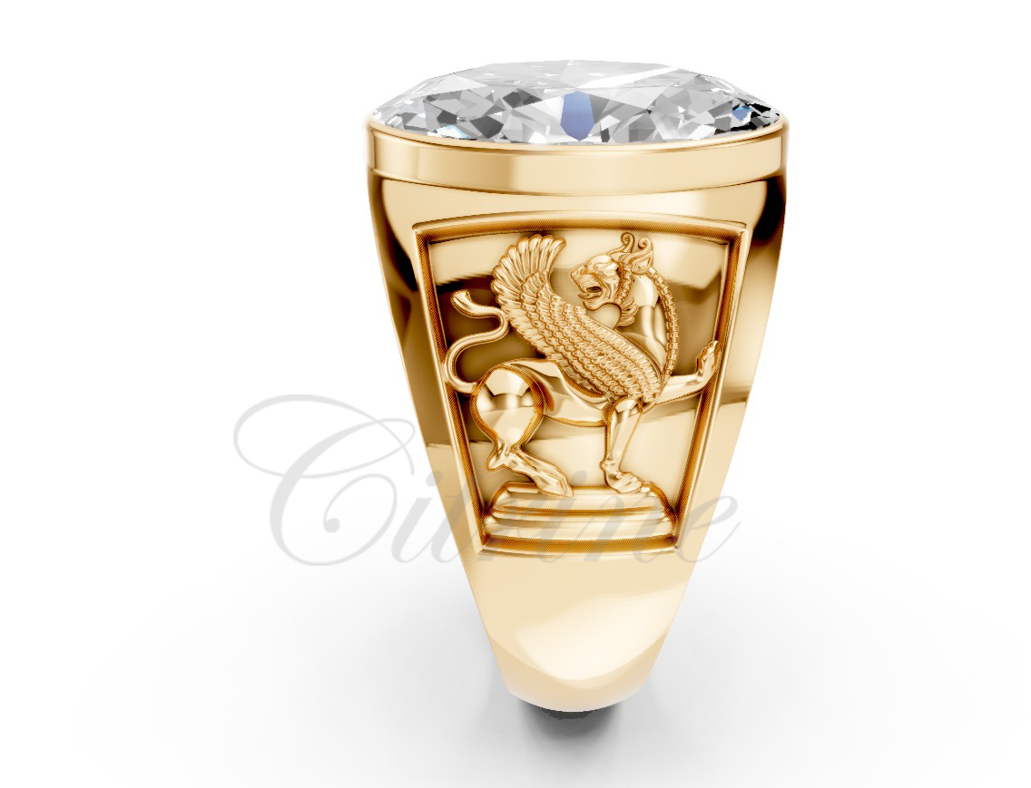 Experience the grandeur of ancient Persia with this exclusive signet ring. Crafted in luminous yellow gold, the ring features an intricately sculpted Griffin—a symbol of power, protection, and prestige—on each side. The centerpiece is a stunning large oval-cut gemstone, designed to capture and reflect light magnificently. Perfect for collectors, special occasions, or as a signature statement piece.