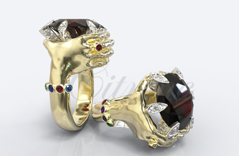 An extraordinary sculptural ring featuring a striking hand motif that firmly grasps a large faceted black gemstone. The claws are detailed with marquise-cut diamonds, while colorful gems accentuate the knuckles and band. A true statement piece merging art and luxury, ideal for collectors and those who dare to stand out.