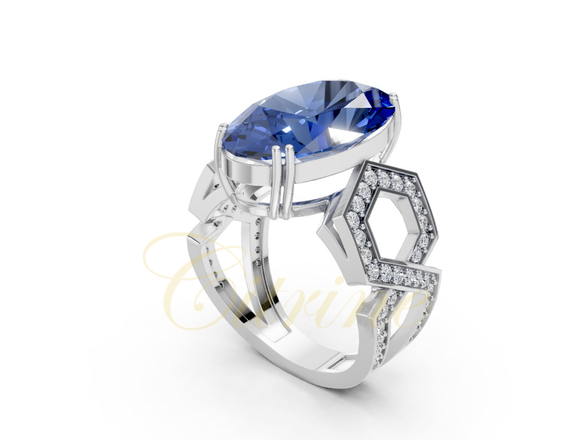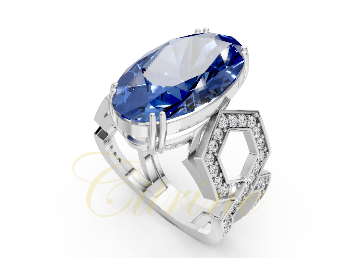 This remarkable white gold ring features an exquisite oval blue sapphire as its centerpiece, framed by a bold openwork geometric design encrusted with brilliant pavé diamonds. The contrast between the clean, modern lines and the intense blue gemstone creates an unforgettable look. Perfect for those who appreciate artistic jewelry with a contemporary edge